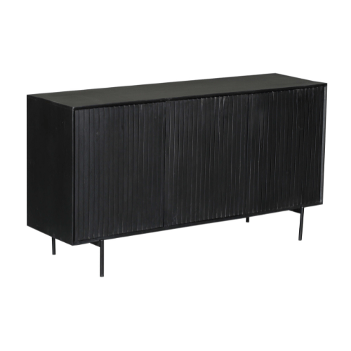 De houten poten van dit dressoir zijn netjes afgewerkt, wat een moderne en tijdloze uitstraling geeft. De buitenkant en zijkanten zijn voorzien van een verticaal lattenpatroon en afgewerkt met een zwarte finish, wat een warme en elegante sfeer creëert.