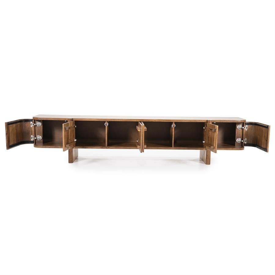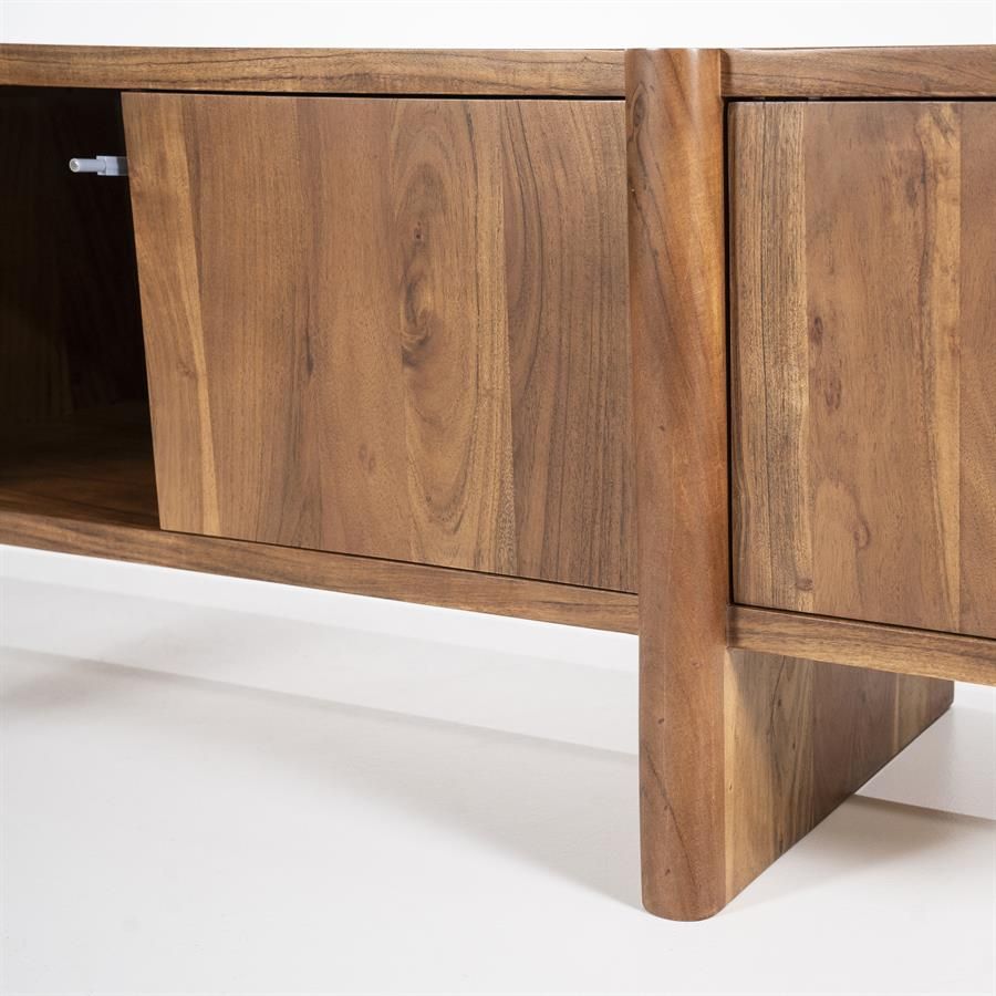 De zes deuren bieden niet alleen voldoende opbergruimte, maar voegen ook een subtiele symmetrie toe aan het ontwerp. Het acaciahout, met zijn unieke houtnerf en warme tinten, geeft het meubel een tijdloze uitstraling die moeiteloos past in diverse interieurstijlen.