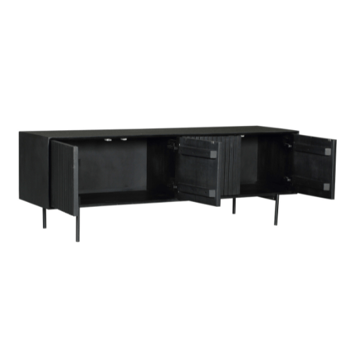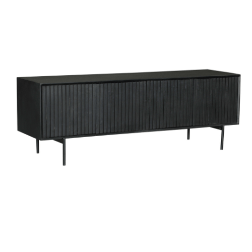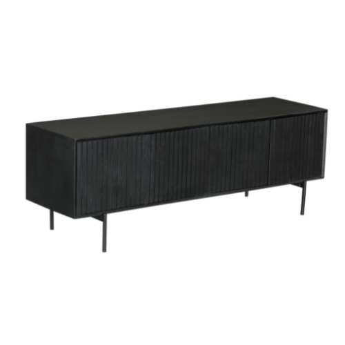 Het ontwerp van het tv-meubel Madison is karakteristiek door zijn verticale lattenpatroon op de deuren. De zwarte lak geeft het meubel een moderne en tijdloze look.